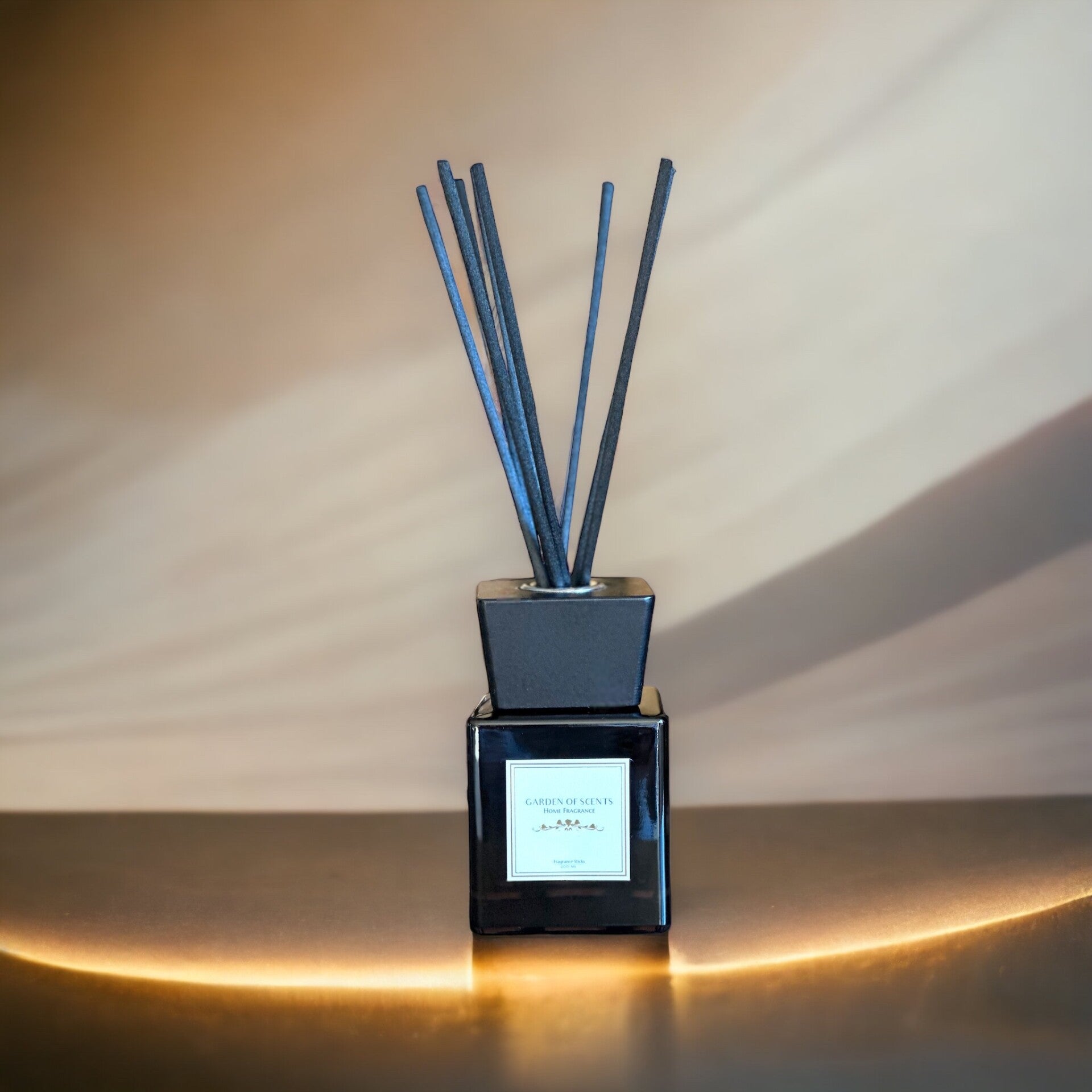 Inhoud: Transparant zwarte 200ml vierkante fles. Zwarte robuuste zwarte vierkante dop. 10 vezel sticks in zwart 25cm lang.